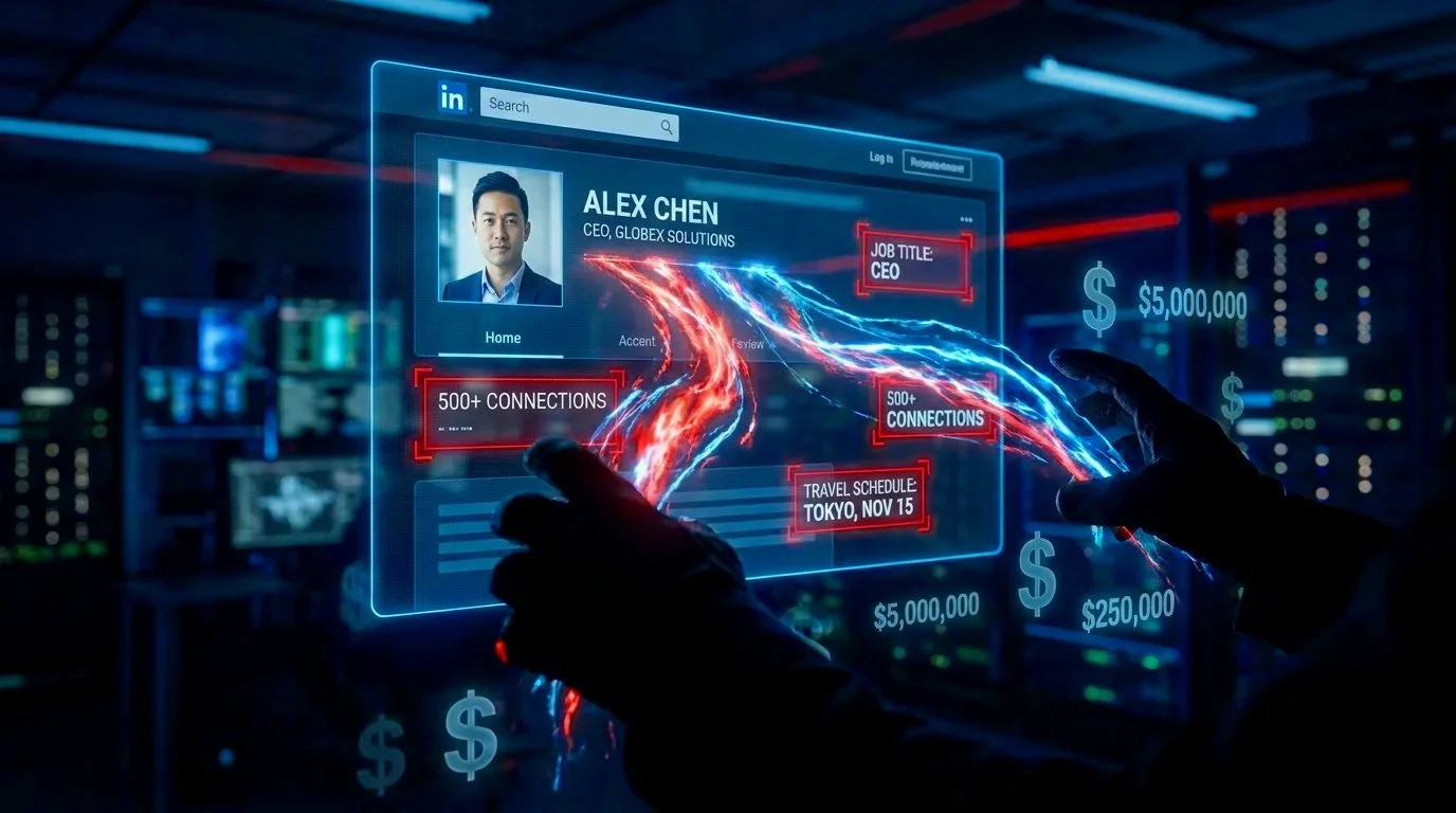 Your LinkedIn profile tells a story. Your name, your company, your role as VP of Finance. Your direct reports. When you're traveling for that conference in Miami next week. Your communication style from the articles you've posted. Your hometown (security question answer). Your previous employers (more security questions). Your MBA from State University (another security question). Your professional network of 500+ connections showing exactly who reports to whom.